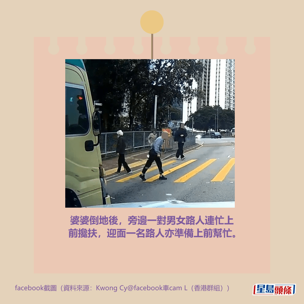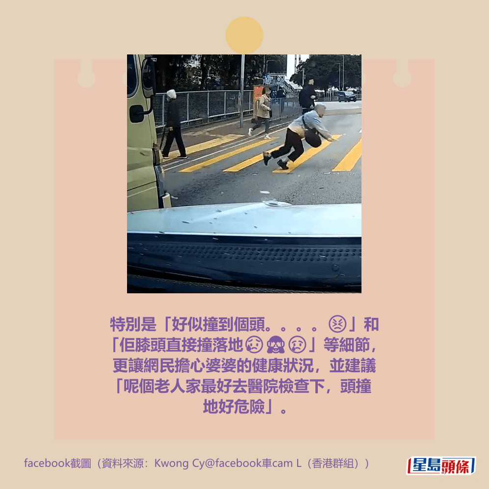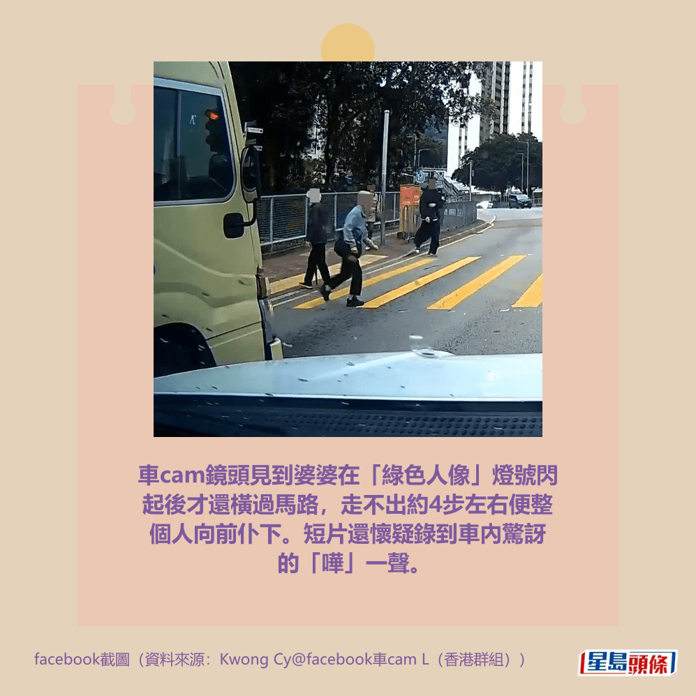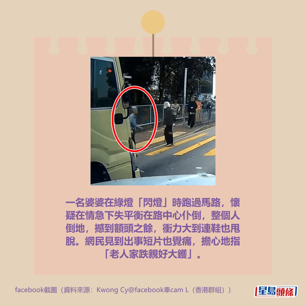 一名婆婆在綠燈「閃燈」時跑過馬路,懷疑在情急下失平衡在路中心仆倒,整個人倒地,撼到額頭之餘,衝力大到連鞋也甩脫。網民見到出事短片也覺痛,擔心地指「老人家跌親好大鑊」。詳情見下圖及下文: