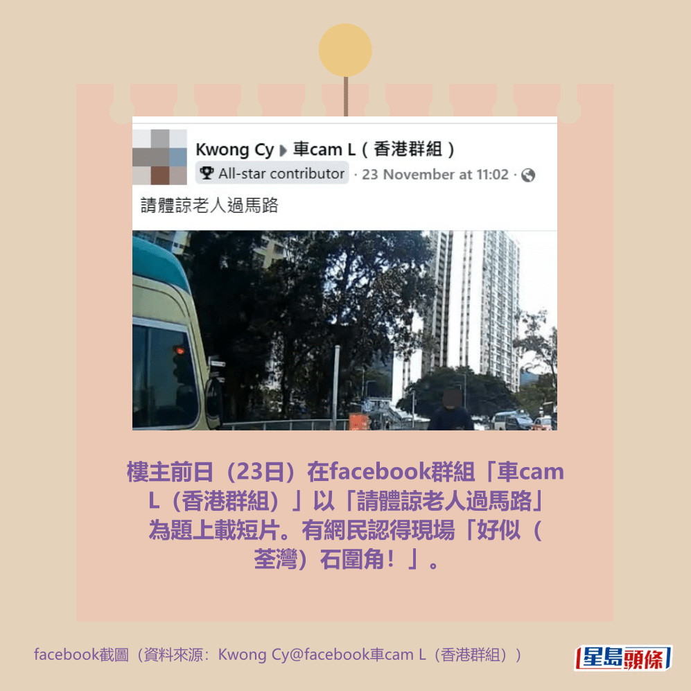 樓主前日(23日)在facebook群組「車cam L(香港群組)」以「請體諒老人過馬路」為題上載短片。有網民認得現場「好似(荃灣)石圍角!」。
