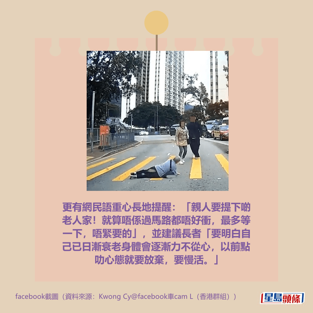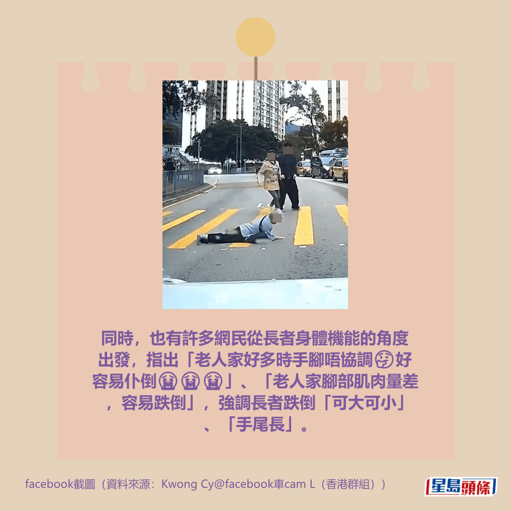 同時,也有許多網民從長者身體機能的角度出發,指出「老人家好多時手腳唔協調🤔好容易仆倒😭😭😭」、「老人家腳部肌肉量差,容易跌倒」,強調長者跌倒「可大可小」、「手尾長」。