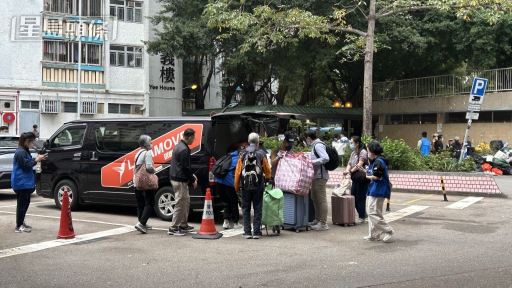 宏志閣居民今早乘坐旅遊巴到達,上樓取回個人物品。