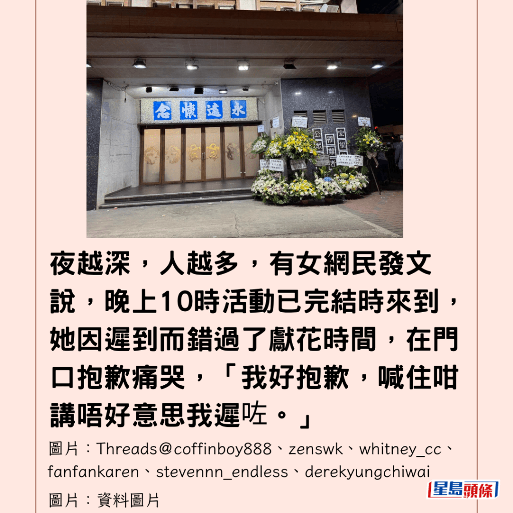 夜越深,人越多,有女網民發文說,晚上10時活動已完結後來到,她因遲到而錯過了獻花時間,在門口抱歉痛哭,「我好抱歉,喊住咁講唔好意思我遲咗。」