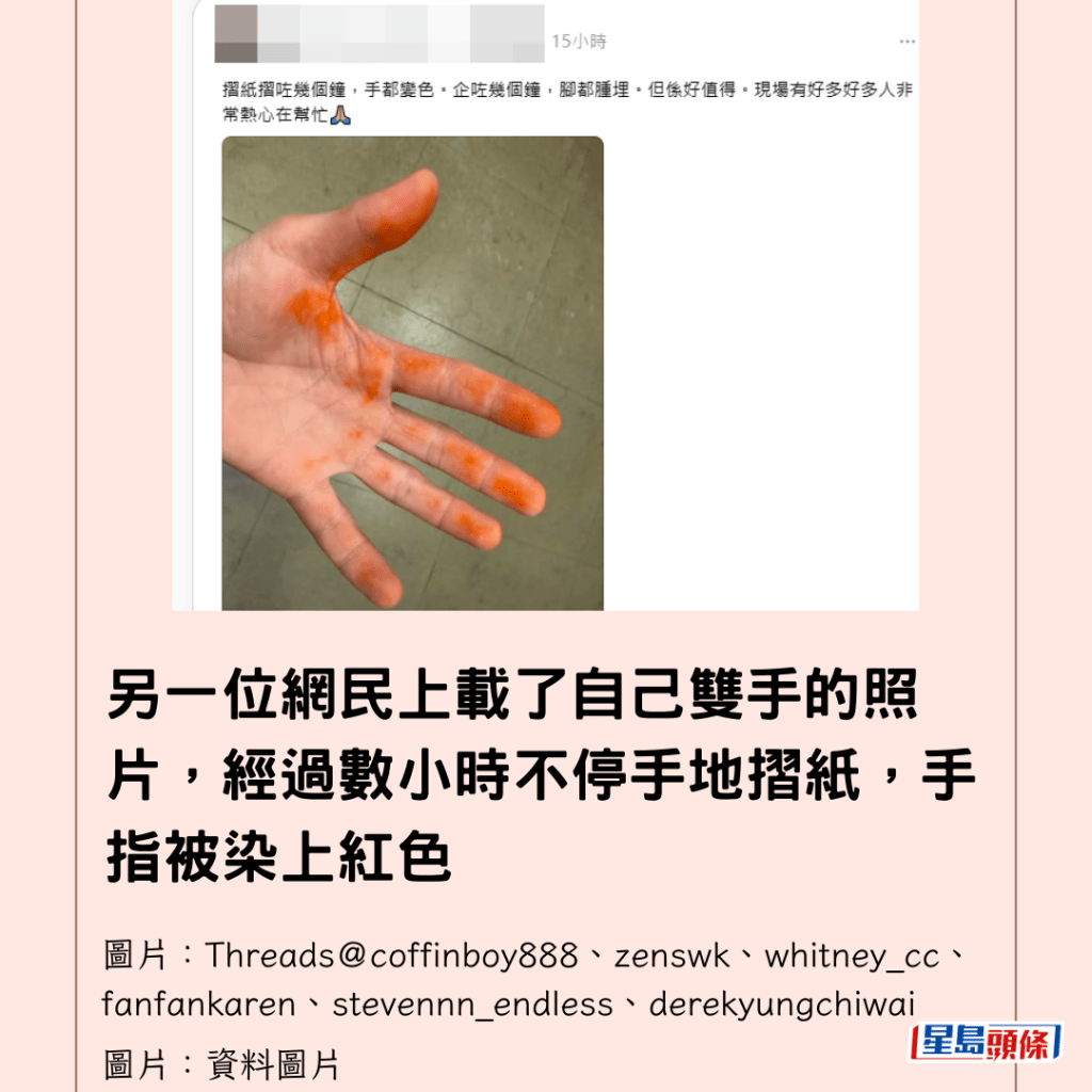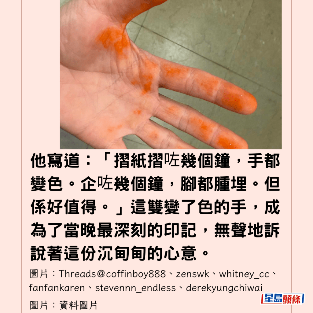 另一位網民上載了自己雙手的照片,經過數小時不停手地摺紙,手指被染上紅色,他寫道:「摺紙摺咗幾個鐘,手都變色,企咗幾個鐘,腳都腫埋,但係好值得。」這雙變了色的手,成為了當晚最深刻的印記,無聲地訴說著這份沉甸甸的心意。