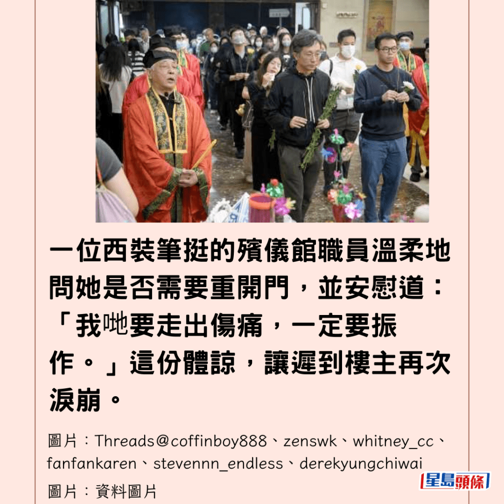 一位西裝筆挺的殯儀館職員溫柔地問她是否需要重開門,並安慰道:「我哋要走出傷痛,一定要振作。」這份體諒,讓遲到樓主再次淚崩。