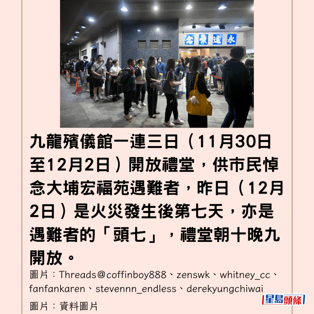九龍殯儀館一連三日(11月30日至12月2日)開放禮堂,供市民悼念大埔宏福苑遇難者,昨日(2日)是火災發生後第七天,亦是遇難者的「頭七」,禮堂朝十晚九開放。
