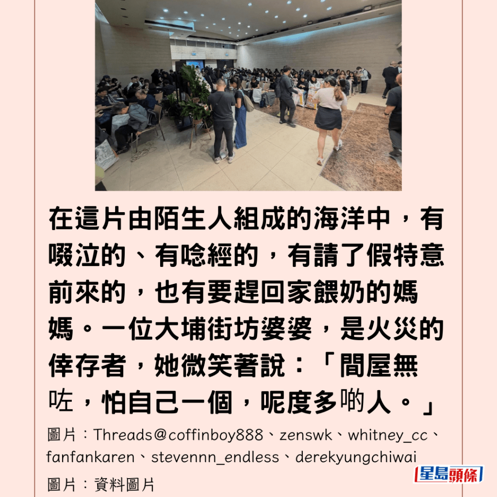 在這片由陌生人組成的海洋中,有啜泣的、有唸經的,有請了假特意前來的,也有要趕回家餵奶的媽媽。一位自稱為「大埔街坊」的婆婆,估計是火災的倖存者,她微笑著說:「間屋無咗,怕自己一個,呢度多啲人。」