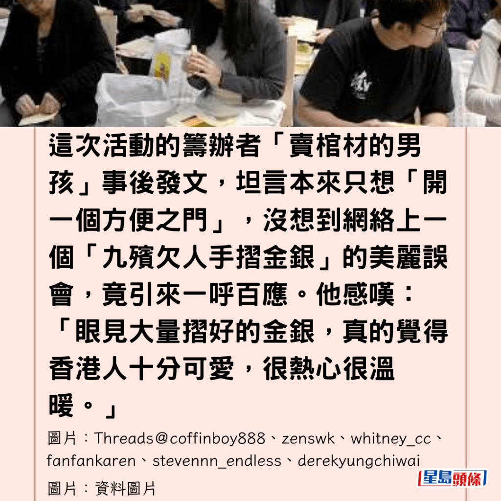這次活動的籌辦者「賣棺材的男孩」事後發文,坦言本來只想「開一個方便之門」,沒想到網絡上一個「九殯欠人手摺金銀」的美麗誤會,竟引來一呼百應。他感嘆:「眼見大量摺好的金銀,真的覺得香港人十分可愛,很熱心很溫暖。」