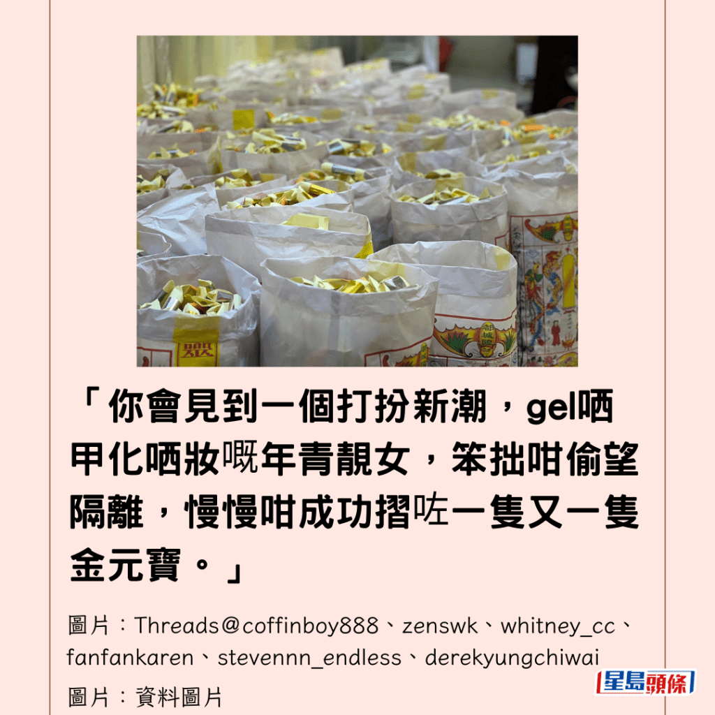 「你會見到一個打扮新潮,gel哂甲化哂妝嘅年青靚女,笨拙咁偷望隔離,慢慢咁成功摺咗一隻又一隻金元寶。」