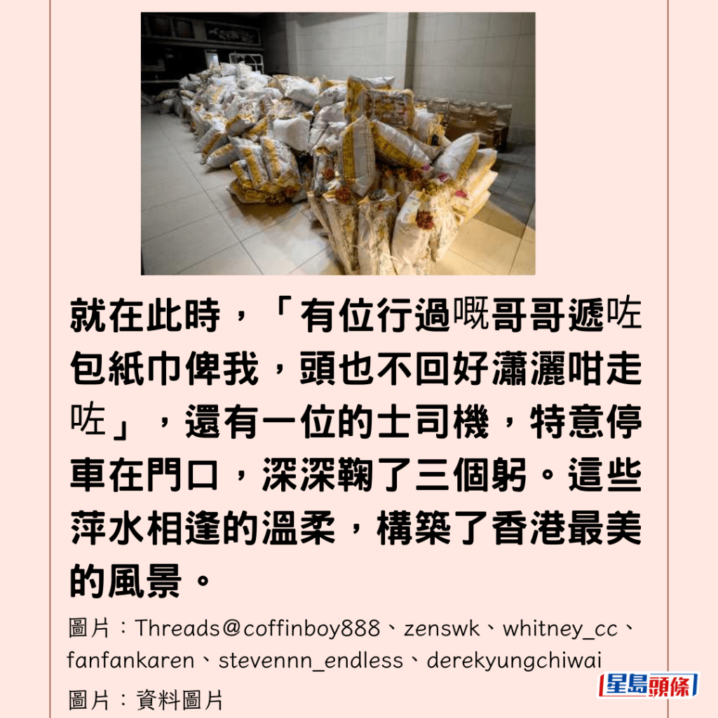 就在此時,「有位行過嘅哥哥遞咗包紙巾俾我,頭也不回好瀟灑咁走咗」,還有一位的士司機,特意停車在門口,深深鞠了三個躬。這些萍水相逢的溫柔,構築了香港最美的風景。