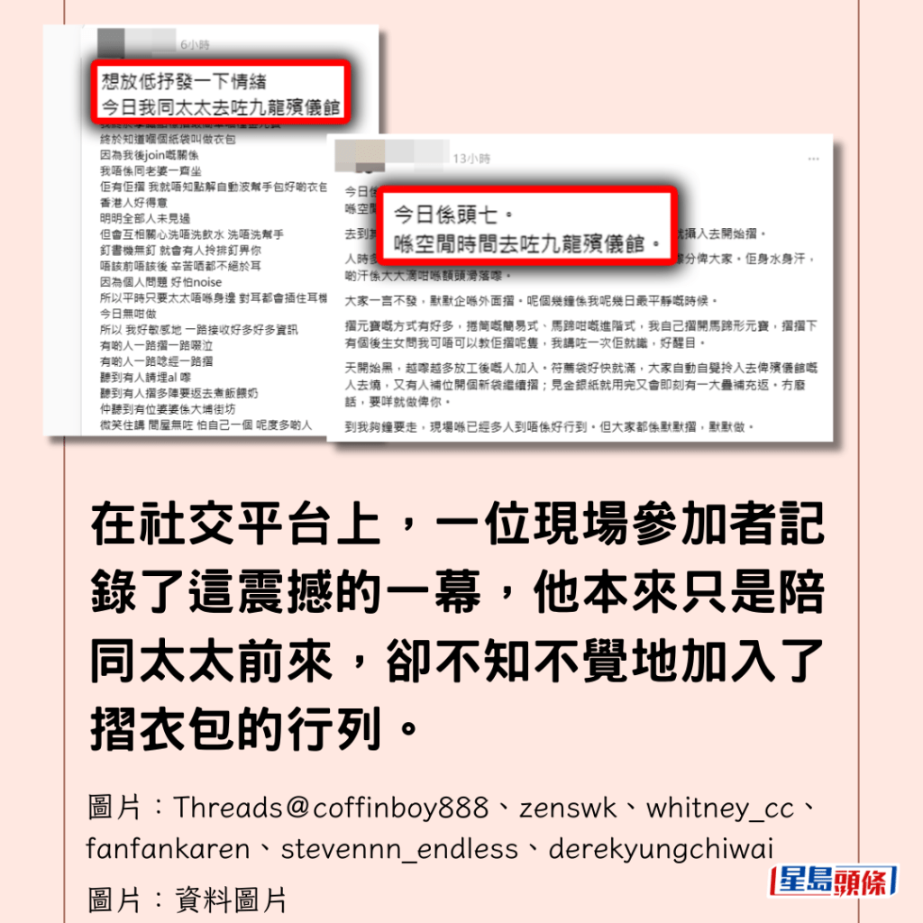 在社交平台上,一位現場參加者記錄了這震撼的一幕,他本來只是陪同太太前來,卻不知不覺地加入了摺衣包的行列。