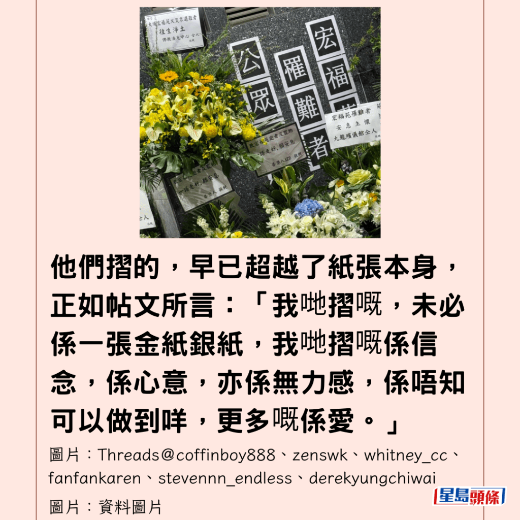 他們摺的,早已超越了紙張本身,正如帖文所言:「我哋摺嘅,未必係一張金紙銀紙,我哋摺嘅係信念,係心意,亦係無力感,係唔知可以做到咩,更多嘅係愛。」