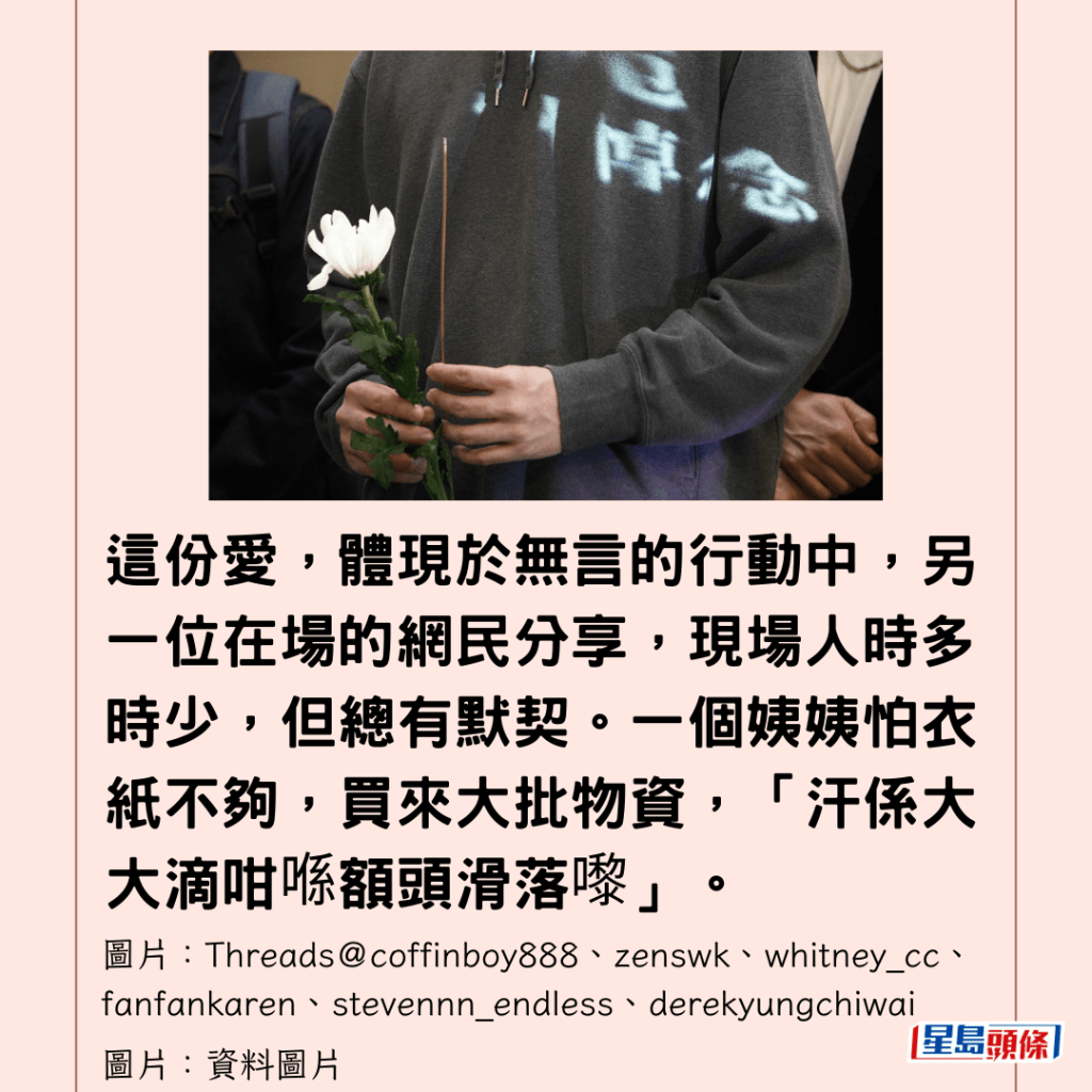 這份愛,體現於無言的行動中,另一位在場的網民分享,現場人時多時少,但總有默契。一個姨姨怕衣紙不夠,買來大批物資,「汗係大大滴咁喺額頭滑落嚟」。