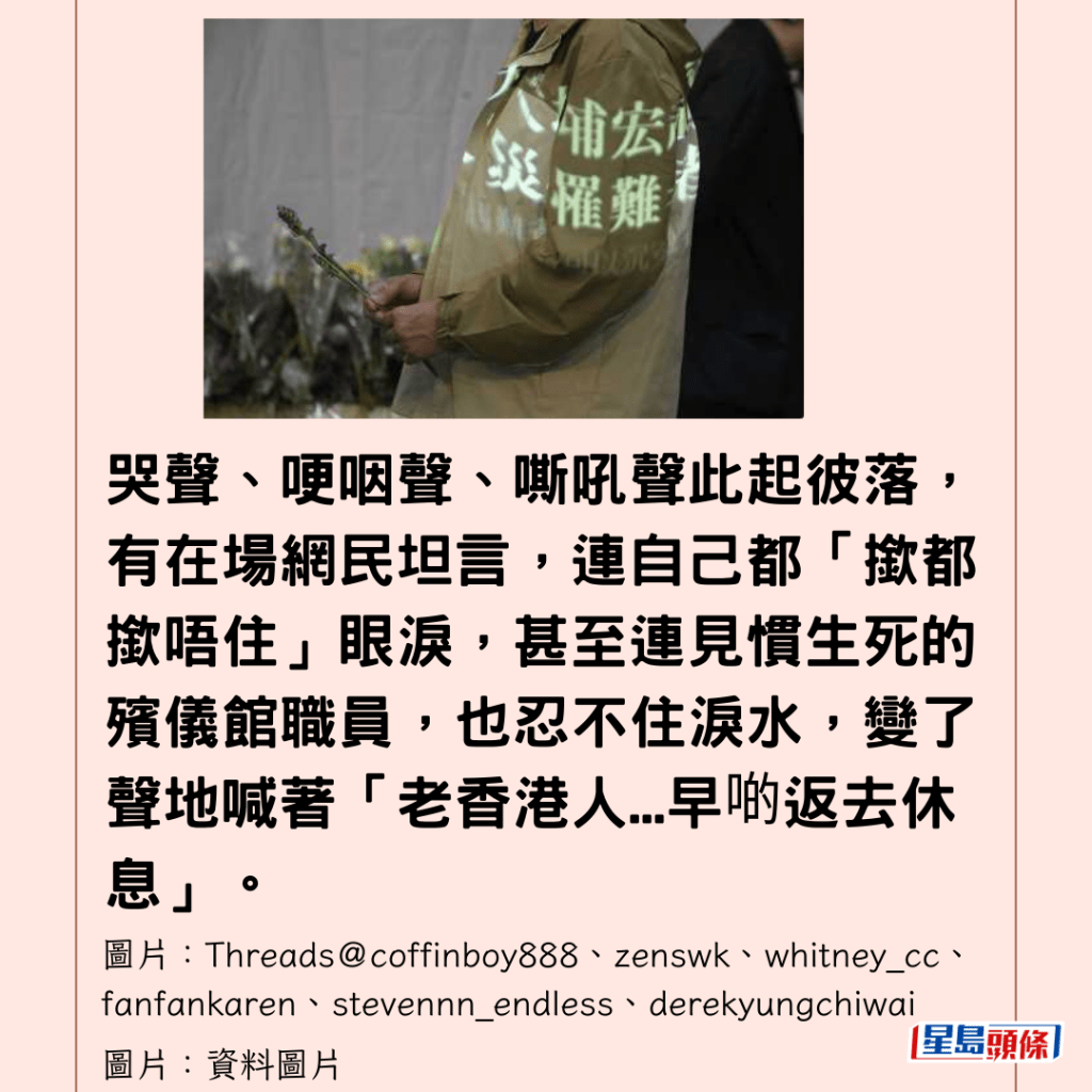 哭聲、哽咽聲、嘶吼聲此起彼落,有在場網民坦言,連自己都「撳都撳唔住」眼淚,甚至連見慣生死的殯儀館職員,也忍不住淚水,變了聲地喊著「老香港人…早啲返去休息」。