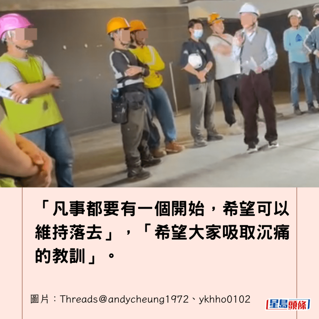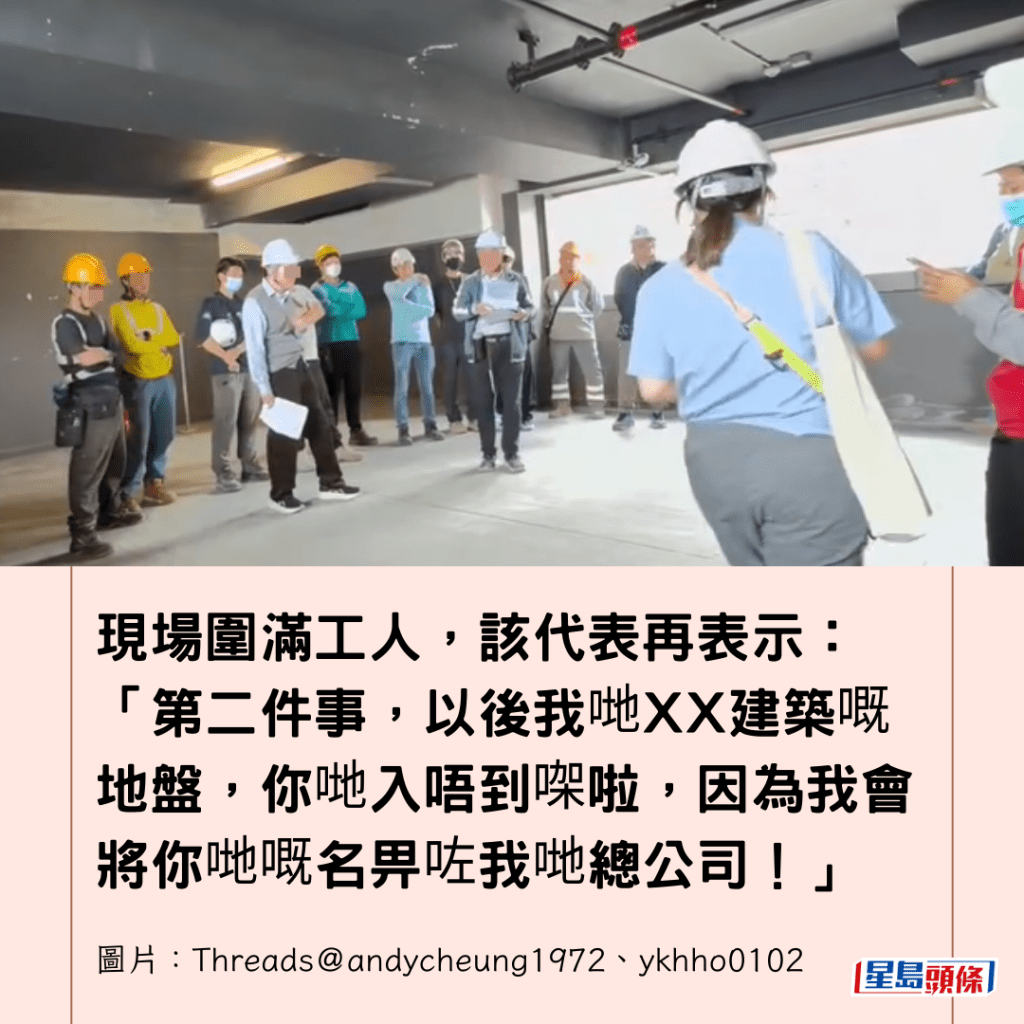 現場圍滿工人,該代表再表示:「第二件事,以後我哋XX建築嘅地盤,你哋入唔到㗎啦,因為我會將你哋嘅名畀咗我哋總公司!」