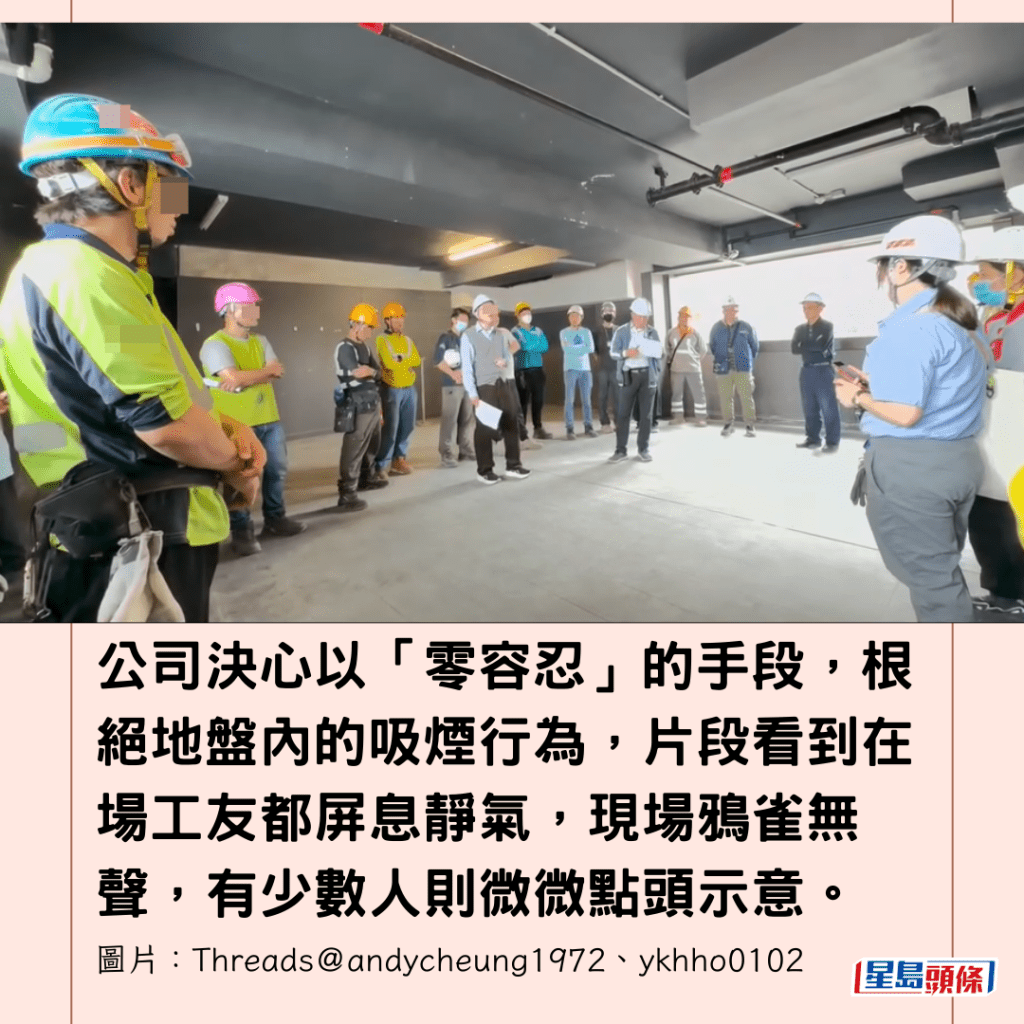 公司決心以「零容忍」的手段,根絕地盤內的吸煙行為,片段看到在場工友都屏息靜氣,現場鴉雀無聲,有少數人則微微點頭示意。