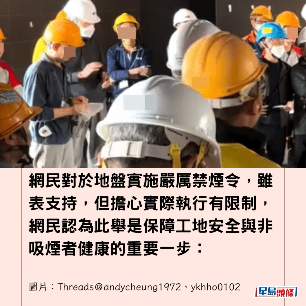 網民對於地盤實施嚴厲禁煙令,雖表支持,但擔心實際執行有限制,網民認為此舉是保障工地安全與非吸煙者健康的重要一步:「凡事都要有一個開始,希望可以維持落去」,「希望大家吸取沉痛的教訓」。