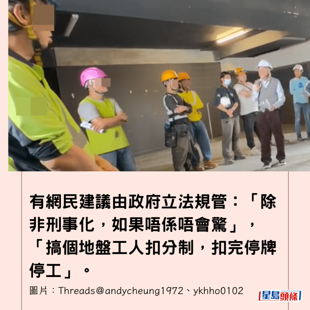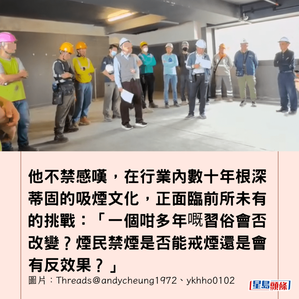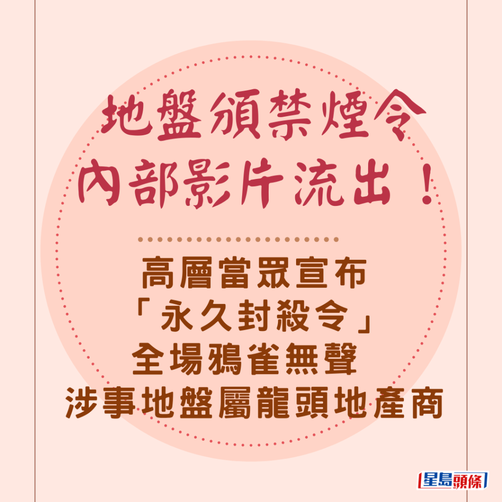大埔宏福苑大火後,地盤紛紛推出最辣禁煙令,一段地盤內部訓示禁煙的影片在網上流出,片中管理層代表,向眾多工友頒布「最嚴」禁煙令,並強調違者將面臨「永久封殺」,其強硬措辭與嚴厲後果,令地盤瞬間鴉雀無聲。據知,涉事地盤屬龍頭地產商所屬建築工程公司。