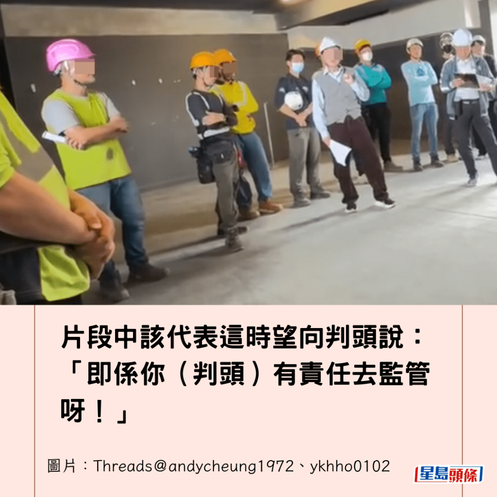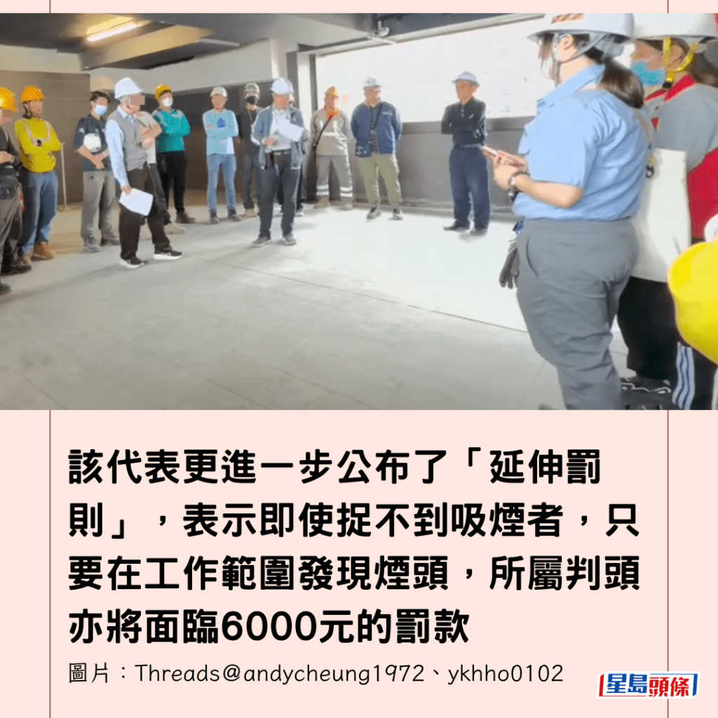 該代表更進一步公布了「延伸罰則」,表示即使捉不到吸煙者,只要在工作範圍發現煙頭,所屬判頭亦將面臨6000元的罰款,片段中該代表這時望向判頭說:「即係你(判頭)有責任去監管呀!」