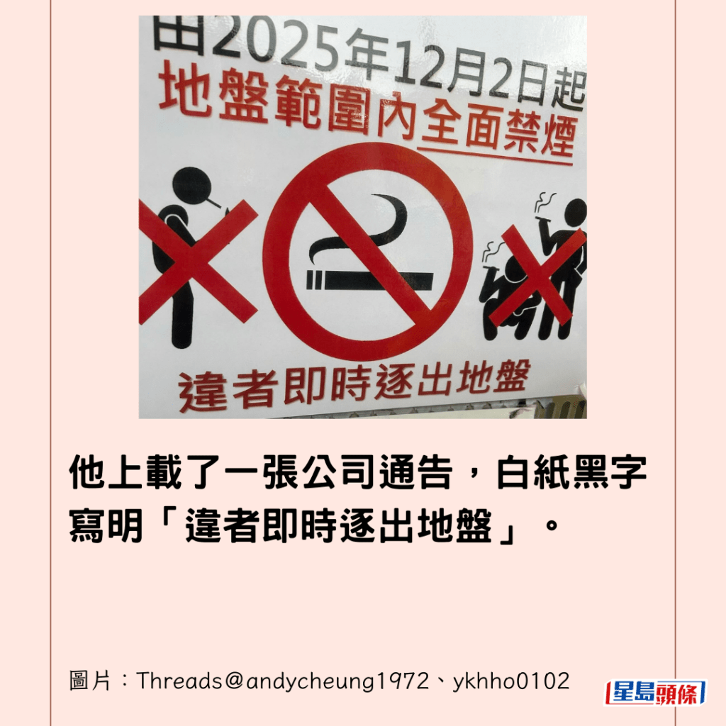 另一位任職地盤的網民亦發文,詳細記錄了其地盤在禁煙令實施首日的嚴峻情況。他上載了一張公司通告,白紙黑字寫明「違者即時逐出地盤」。他描述當天上班時,地盤門口已設崗查袋,「連火機都唔俾拎」,其嚴格程度可見一斑。