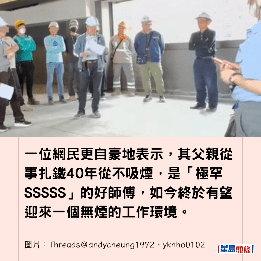 一位網民更自豪地表示,其父親從事扎鐵40年從不吸煙,是「極罕SSSSS」的好師傅,如今終於有望迎來一個無煙的工作環境。