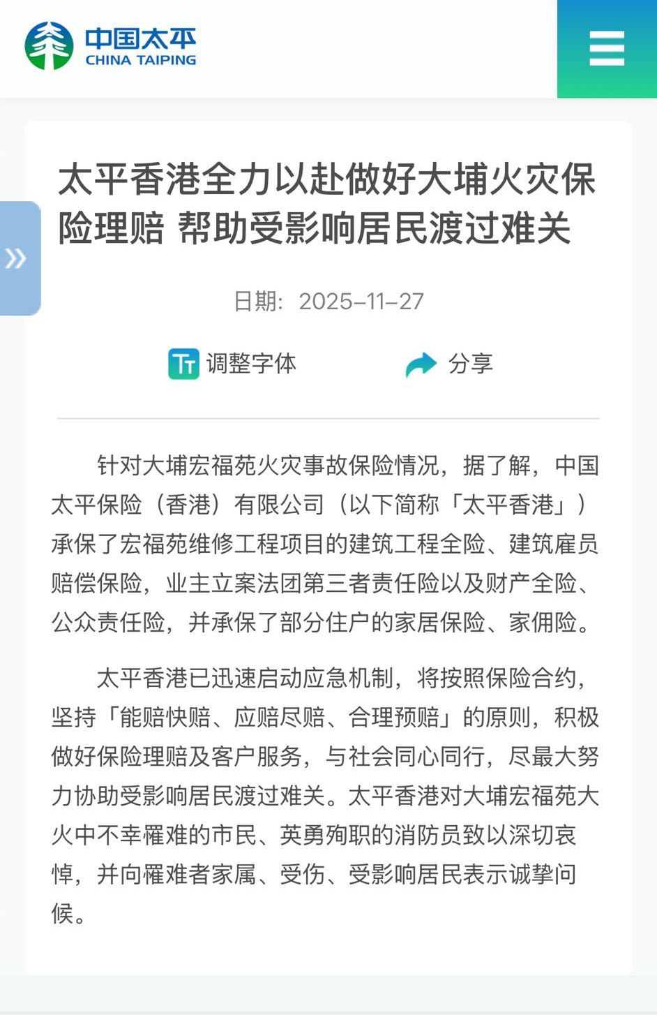 針對大埔宏福苑火災事故保險情況,母公司中國太平(966)上周五(11月28日)發出聲明指,太平香港承保了宏福苑維修工程項目的建築工程全險、建築僱員賠償保險,業主立案法團第三者責任險以及財產全險、公眾責任險,並承保了部分住戶的家居保險、家傭險。太平香港將按照保險合約,堅持「能賠快賠、應賠盡賠、合理預賠」的原則,強調做好保險理賠及客戶服務。
