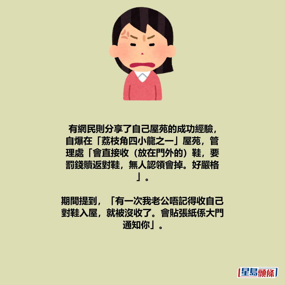 有網民則分享了自己屋苑的成功經驗,自爆在「荔枝角四小龍之一」屋苑,管理處「會直接收(放在門外的)鞋,要罰錢贖返對鞋,無人認領會掉。好嚴格」,期間提到,「有一次我老公唔記得收自己對鞋入屋,就被沒收了。會貼張紙係大門通知你」。