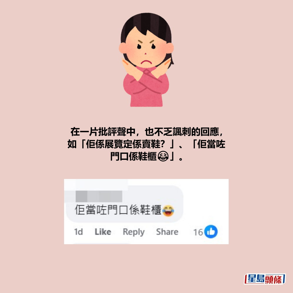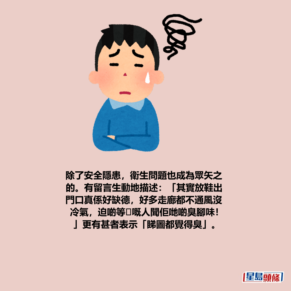 除了安全隱患,衛生問題也成為眾矢之的。有留言生動地描述:「其實放鞋出門口真係好缺德,好多走廊都不通風沒冷氣,迫啲等𨋢嘅人聞佢哋啲臭腳味!」更有甚者表示「睇圖都覺得臭」。在一片批評聲中,也不乏諷刺的回應,如「佢係展覽定係賣鞋?」、「佢當咗門口係鞋櫃😂」。