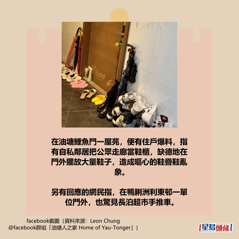 大埔宏福苑一場五級大火,燃起了市民的防火安全意識,對鄰居一些危險隱患更加大力揭露,用力打擊。在油塘鯉魚門一屋苑,便有住戶爆料,指有自私鄰居把公眾走廊當鞋櫃,缺德地在門外擺放大量鞋子,造成嘔心的鞋疊鞋亂象。另有回應的網民指,在鴨脷洲利東邨一單位門外,也驚見長泊超市手推車。詳情見下圖及下文: