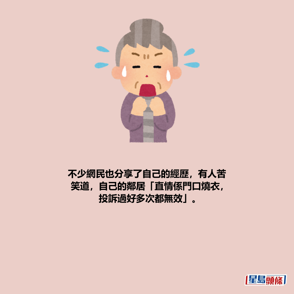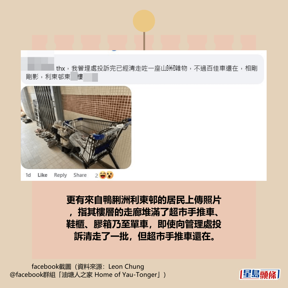 不少網民也分享了自己的經歷,有人苦笑道,自己的鄰居「直情係門口燒衣,投訴過好多次都無效」。更有來自鴨脷洲利東邨的居民上傳照片,指其樓層的走廊堆滿了超市手推車、鞋櫃、膠箱乃至單車,即使向管理處投訴清走了一批,但超市手推車還在。