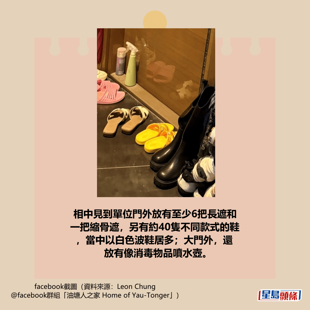 相中見到單位門外放有至少6把長遮和一把縮骨遮,另有約40隻不同款式的鞋,當中以白色波鞋居多;大門外,還放有像消毒物品噴水壺。