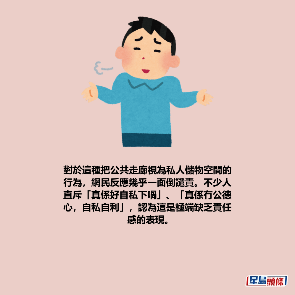 對於這種把公共走廊視為私人儲物空間的行為,網民反應幾乎一面倒譴責。不少人直斥「真係好自私下喎」、「真係冇公德心,自私自利」,認為這是極端缺乏責任感的表現。