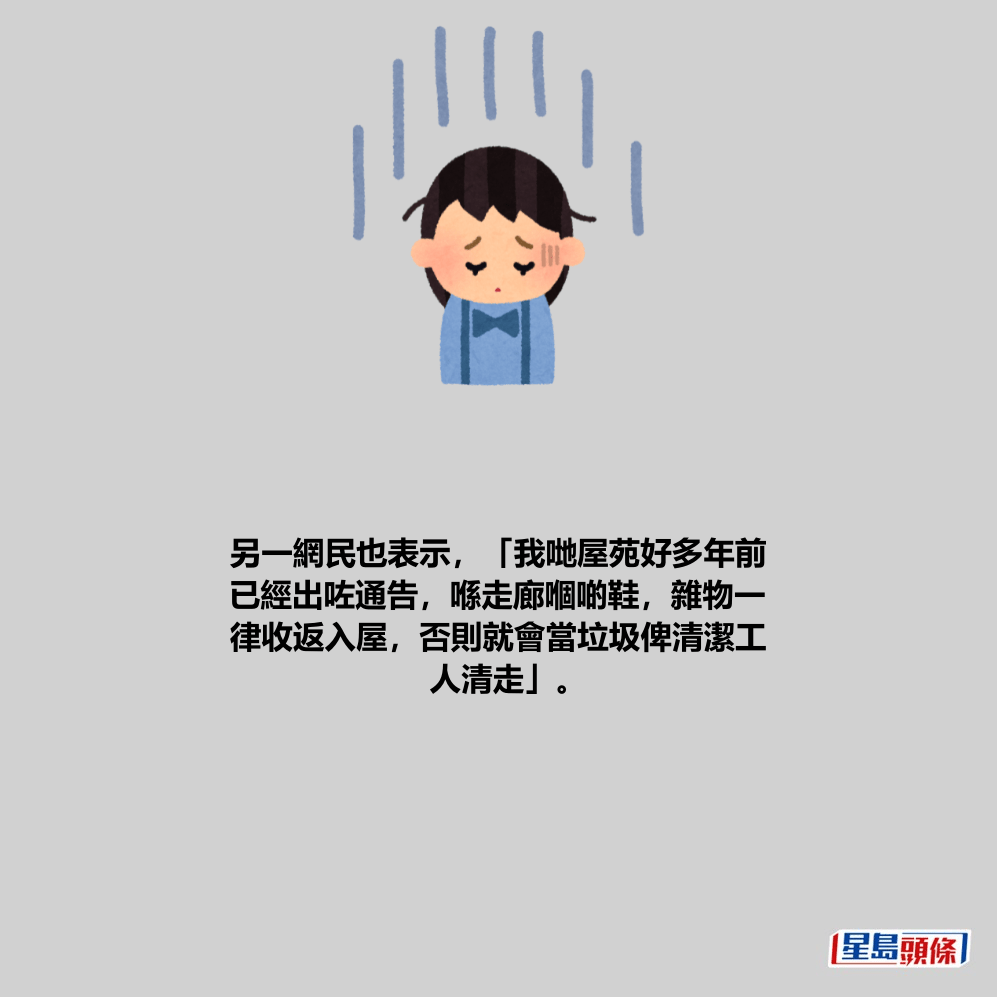 另一網民也表示,「我哋屋苑好多年前已經出咗通告,喺走廊嗰啲鞋,雜物一律收返入屋,否則就會當垃圾俾清潔工人清走」。