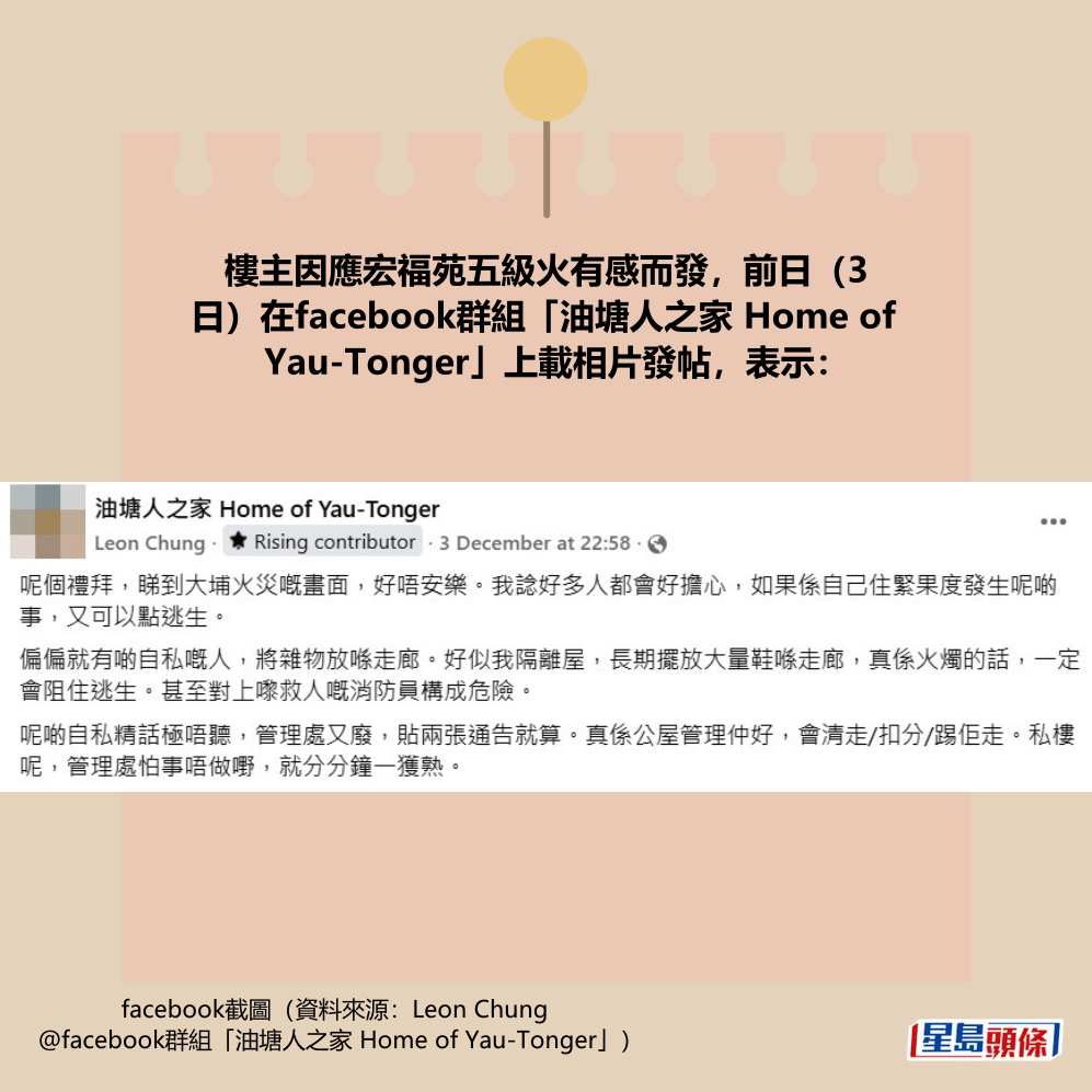 樓主因應宏福苑五級火有感而發,前日(3日)在facebook群組「油塘人之家 Home of Yau-Tonger」上載相片發帖,表示「呢個禮拜,睇到大埔火災嘅畫面,好唔安樂。我諗好多人都會好擔心,如果係自己住緊嗰度發生呢啲事,又可以點逃生」。