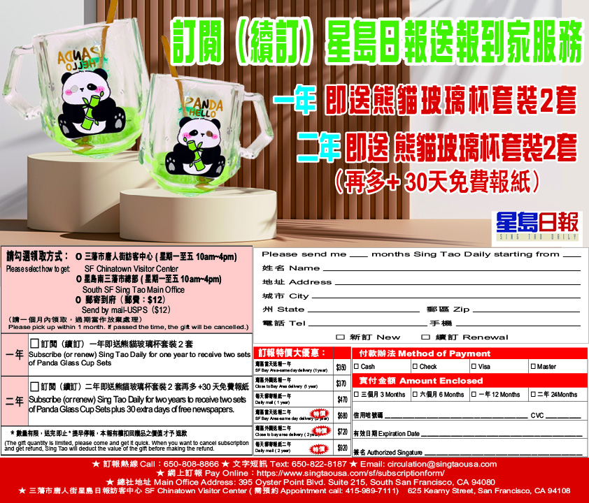 Tel:1-800-SINGTAO , 1-650-808-8866, Fax: 1-650-808-8867 Text: 1-650-822-8187 上午九時至下午五時,星期一至五,公眾假期休息。 |
